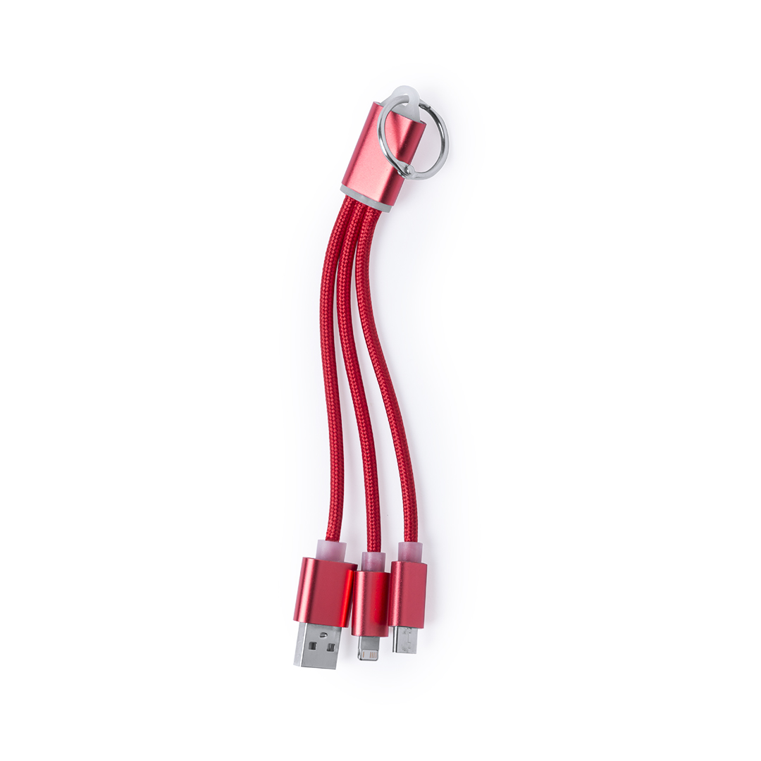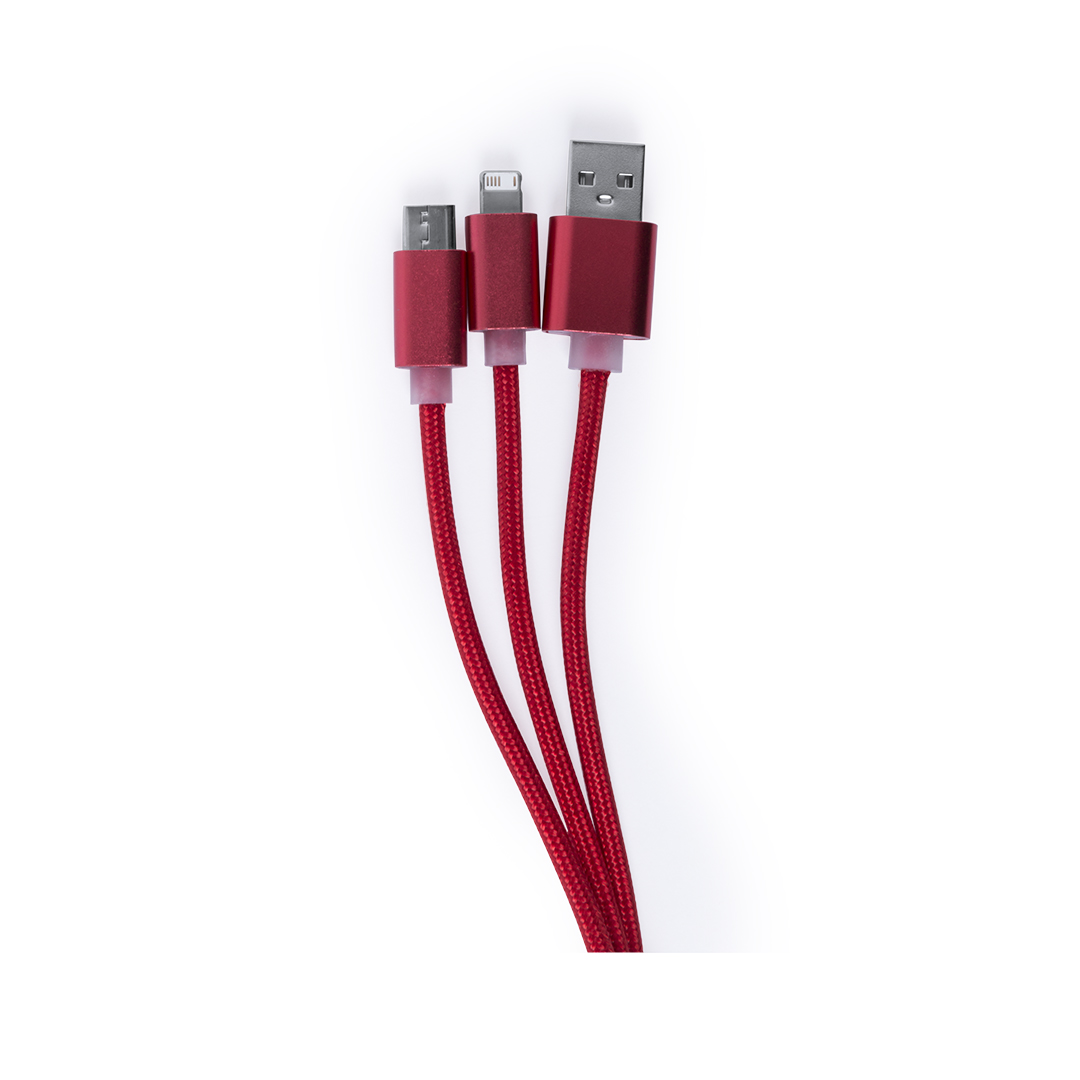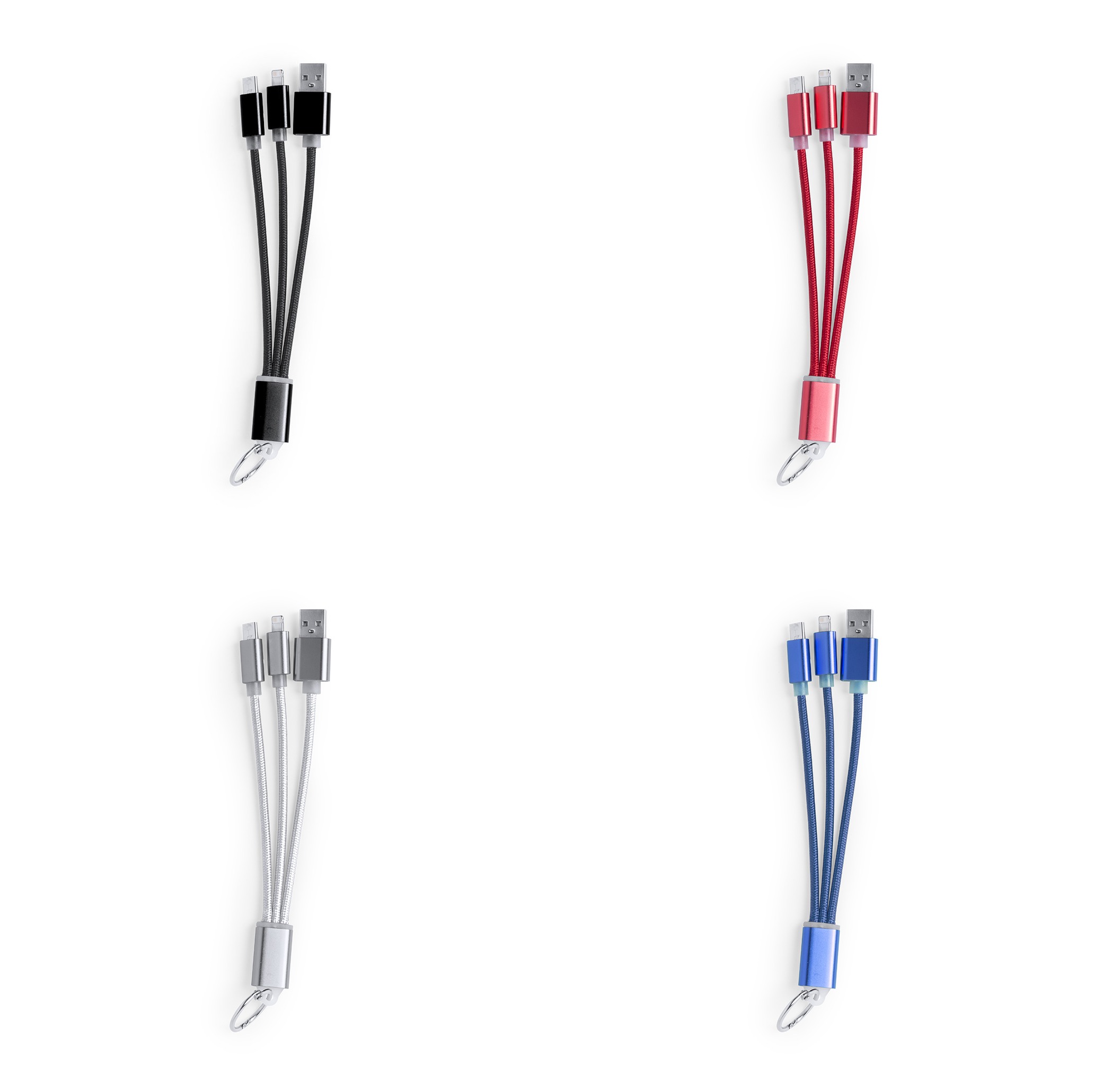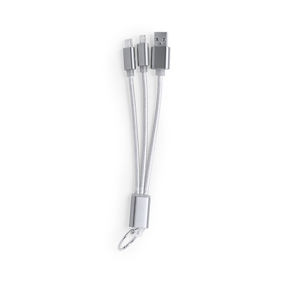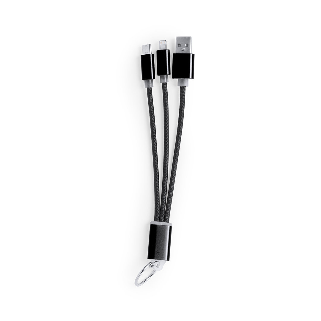 Cabo carregador USB Lightning 3 em 1, com conexões USB Type-C, USB e Lightning. Com revestimento de nylon extra resistente para uso intensivo e conectores em alumínio, e argola para prender facilmente a qualquer lugar.