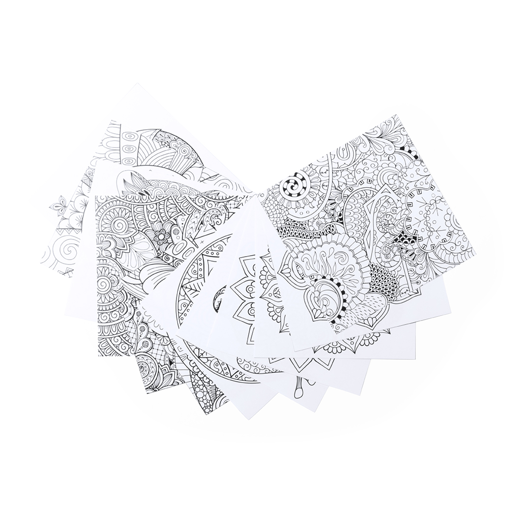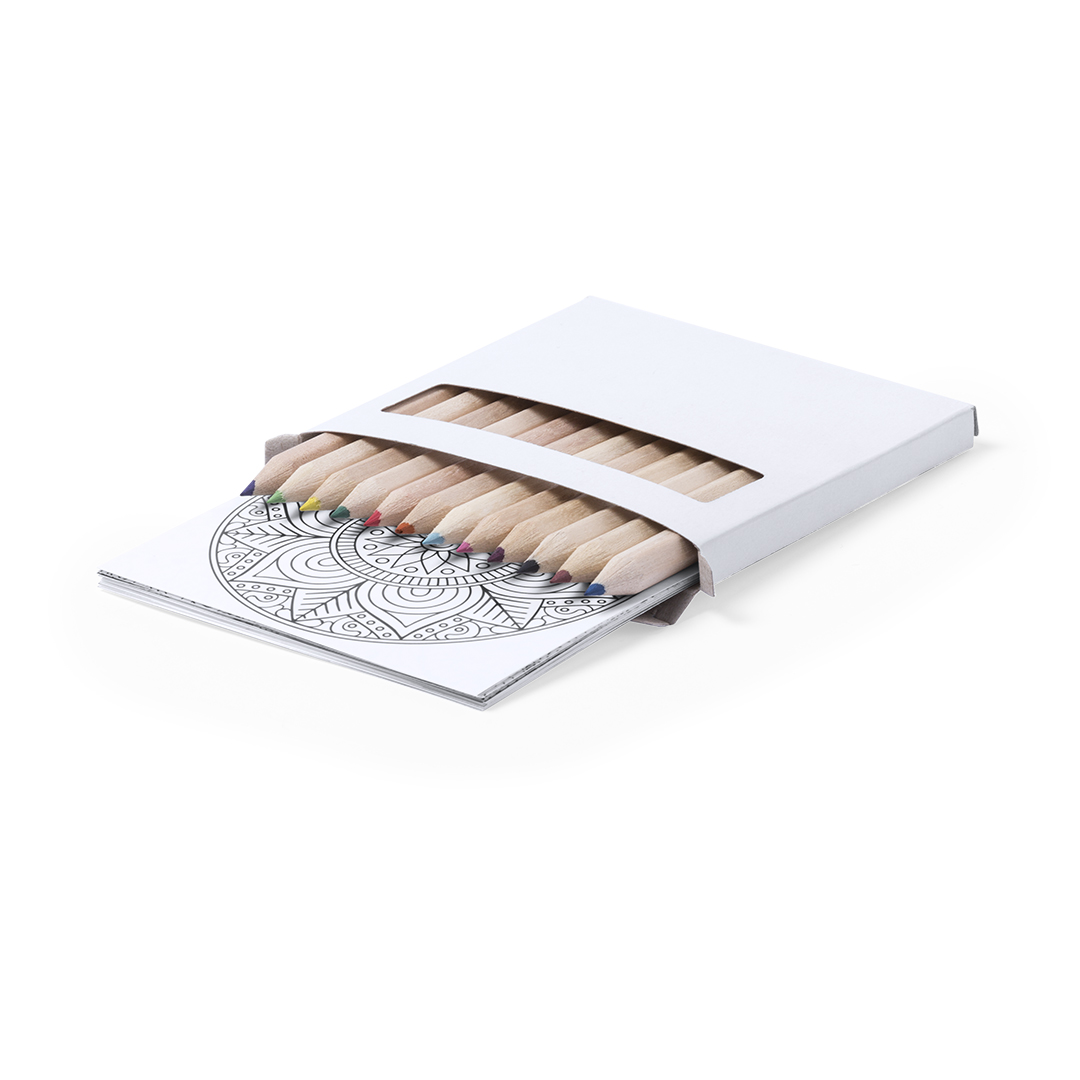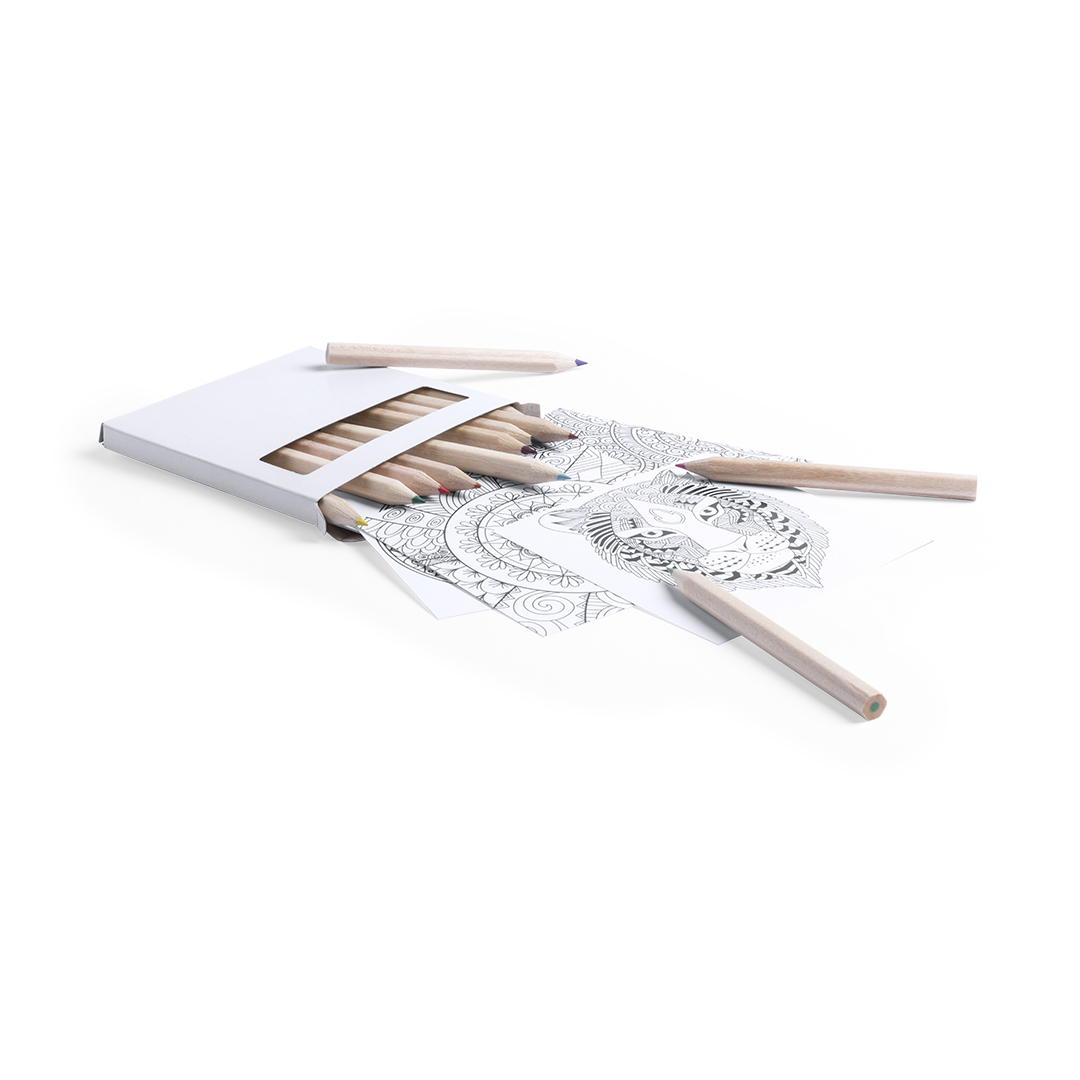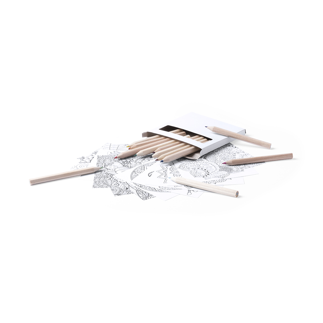Conjunto pequeno de lápis e Mandalas para colorir. Inclui 12 lápis em forma hexagonal e 12 folhas com mandalas diferentes. Apresentado em caixa de papelão com janela.